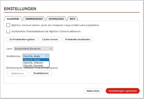 Sie können versuchen, zwischen den OpenGL-Modi in MyDrive Connect umzuschalten. Führen Sie dazu die folgenden Schritte aus: