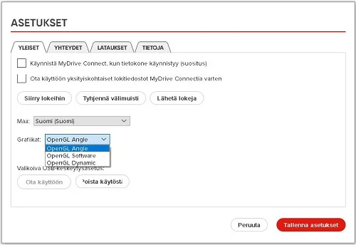 Voit yrittää vaihdella eri OpenGL-tilojen välillä MyDrive Connectissa seuraavien ohjeiden avulla: