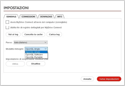 Puoi provare a passare tra le diverse modalità OpenGL in MyDrive Connect seguendo la procedura riportata di seguito: