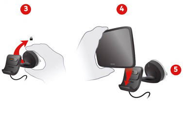 - Trykk holderen godt mot frontruten, og snu sokkelen med klokken til du kjenner at den låses på plass.