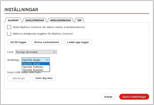 Du kan prova att byta mellan de olika OpenGL-lägena i MyDrive Connect genom att följa instruktionerna: